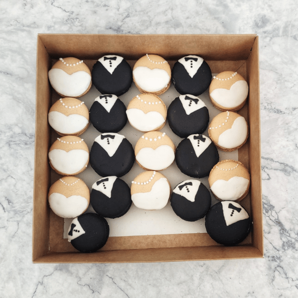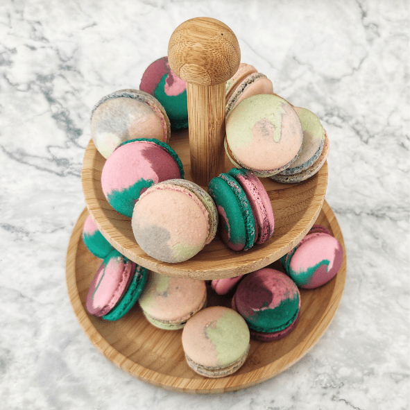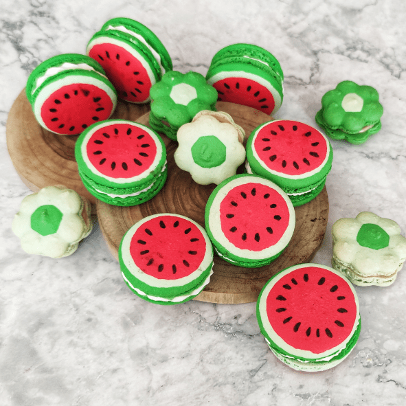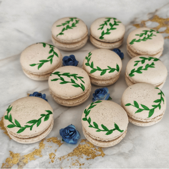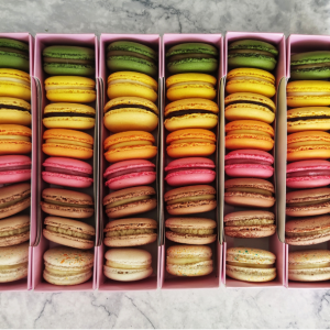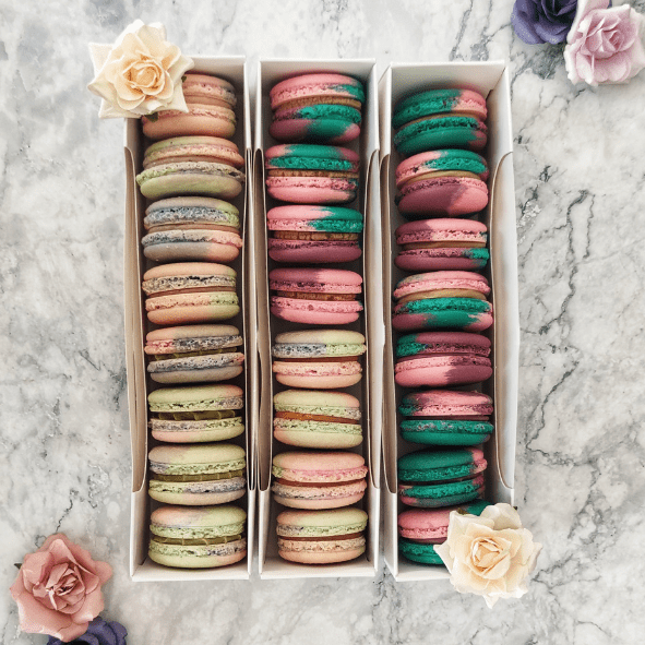 אפשרות לקבל מקרונים בשלושה צבעים לבחירתכם או מצויירים לפי רצונכם ניתן לבחור עד 8 טעמים שונים לכל הזמנה הטעמים של המקרונים: שוקולד מריר, אננס, קוקוס, פינה קולדה, פסיפלורה, בננה, שוקו בננה, תות, פטל, לימון, פיסטוק, קינדר בואנו, ריסס, קרמל מלוח וקפה